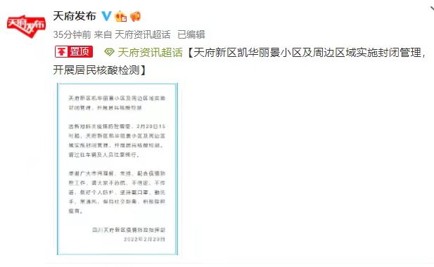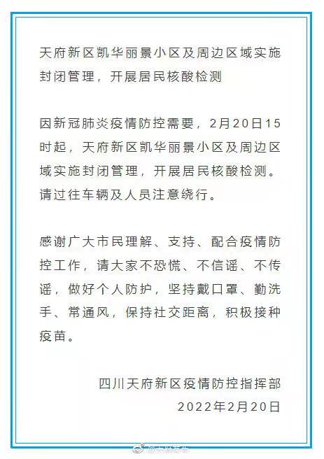 2月20日,据四川天府新区管理委员会官方微博消息,成都市天府新区凯华丽景小区及周边区域实施封闭管理,开展居民核酸检测。