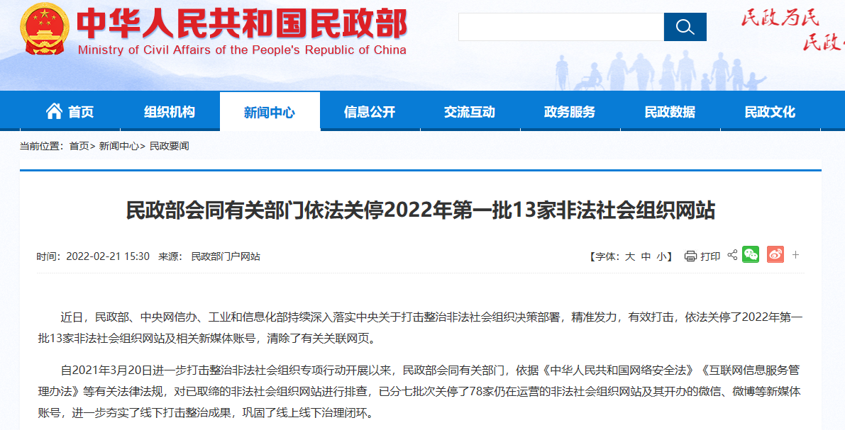 近日,民政部、中央网信办、工业和信息化部持续深入落实中央关于打击整治非法社会组织决策部署,精准发力,有效打击,依法关停了2022年第一批13家非法社会组织网站及相关新媒体账号,清除了有关关联网页。
