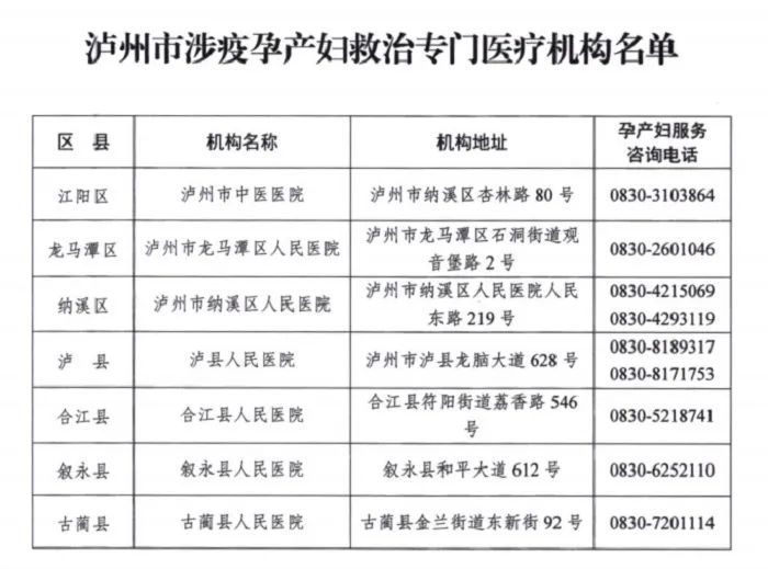 泸州市涉疫孕产妇救治专门医疗机构名单及咨询电话