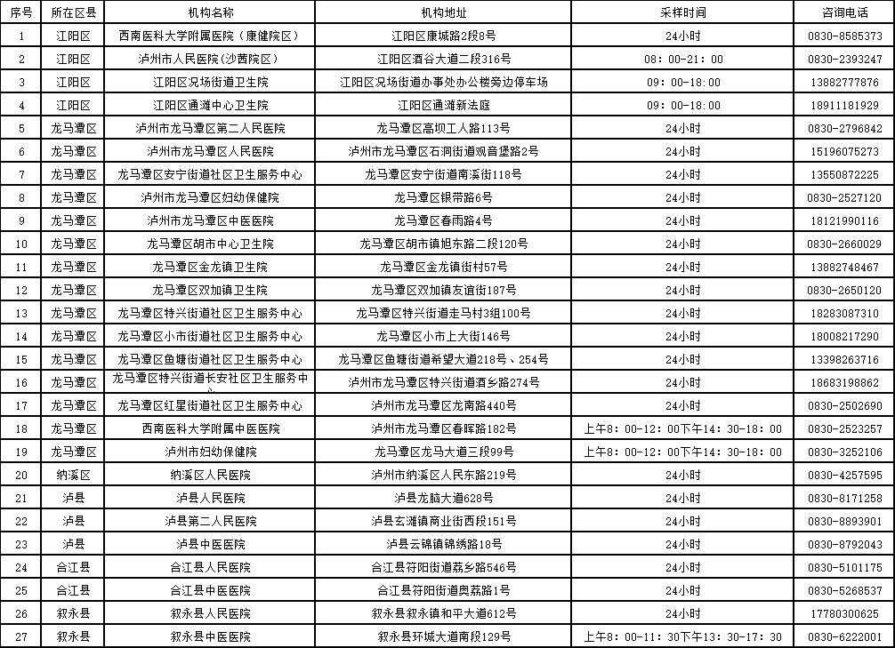 泸州市“黄码”人员新冠病毒核酸检测采样机构名单