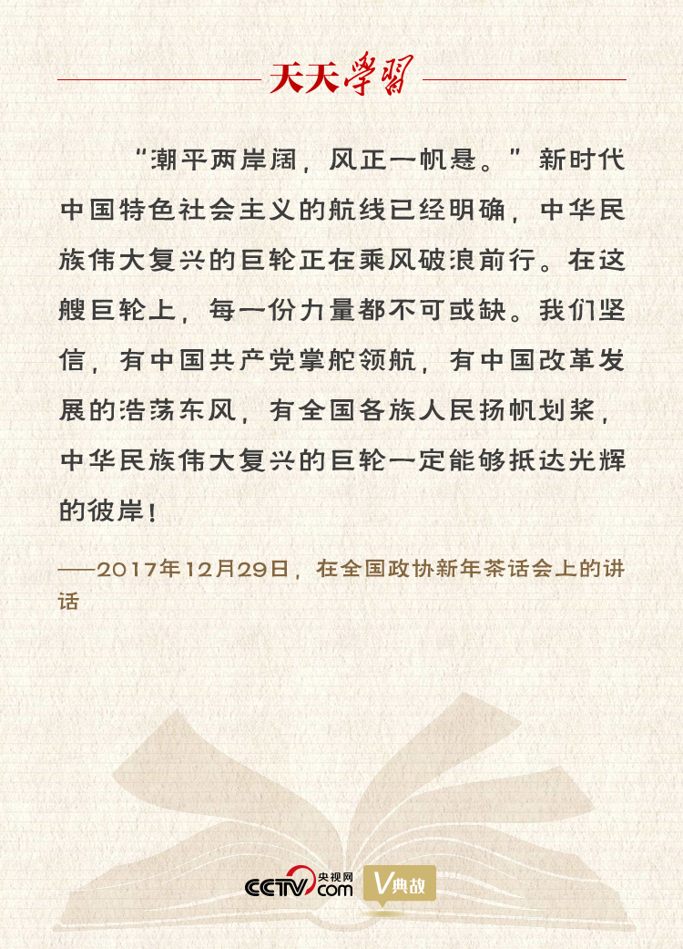 两个多月后的岁末迎新之际,习近平总书记将千古名句“潮平两岸阔,风正一帆悬”信手拈来,寄意深远:新时代中国特色社会主义的航线已经明确,中华民族伟大复兴的巨轮正在乘风破浪前行。“潮平风正”,有中国共产党掌舵领航,有中国改革发展的浩荡东风,有全国各族人民扬帆划桨,中华民族伟大复兴的巨轮一定能够抵达光辉的彼岸!