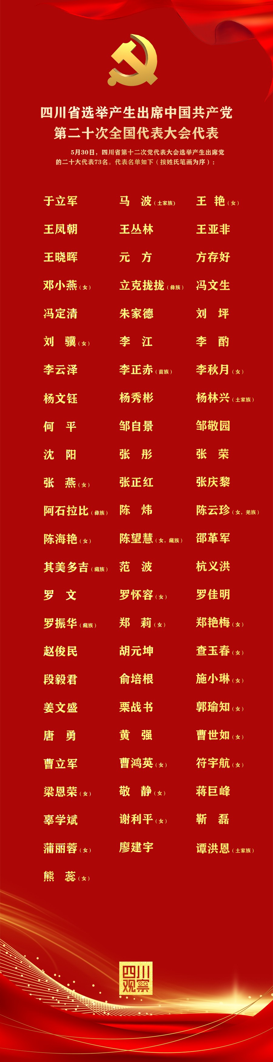 时间:2022-06-03 09:36:43 来源:四川观察5月30日,四川省第十二次党代表大会选举产生出席党的二十大代表73名。代表名单如下(按姓氏笔画为序):