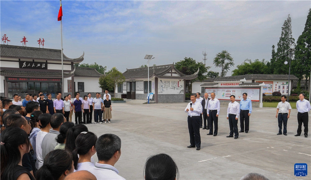 6月8日,中共中央总书记、国家主席、中央军委主席习近平在四川考察。这是8日上午,习近平在眉山市东坡区太和镇永丰村考察时,同村民们亲切交流。新华社记者 申宏 摄