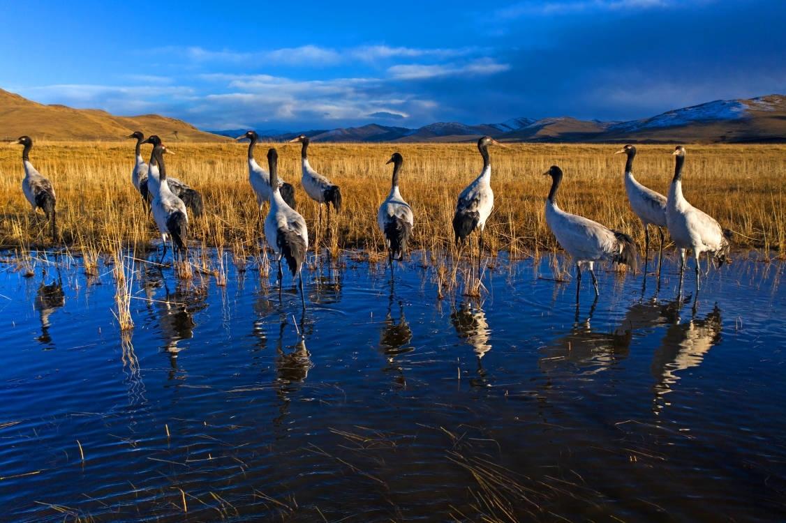 黑颈鹤飞回阿坝县贾曲河畔。尕让泽登/摄