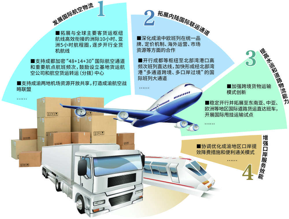 发展国际航空物流。优化国际航线网络,拓展与全球主要客货运枢纽航线高效衔接的洲际10小时、亚洲5小时航程圈,逐步开行全货机航线。支持成都加密“48+14+30”国际航空通道和重要航点航班频次,落实航空货运枢纽建设扶持政策,鼓励设立基地货运航空公司和航空货运转运(分拨)中心。支持成渝两地机场资源开放共享,统筹运力、整合航线,提升国际航空中转能力,共营卡车航班,互为异地货站,打造成渝航空战略联盟。