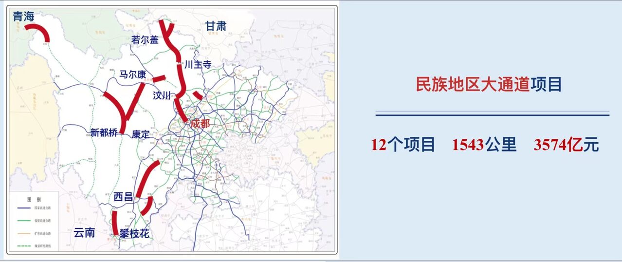 “十四五”期,推进高速公路向民族地区、革命老区等欠发达地区延伸。此次大会招商12个项目、总里程达1543公里、总投资3574亿元。其中主通道项目4个,分别是成都至汶川、汶川至川主寺、川主寺至郎木寺,乐山金口河至西昌;区内互联项目3个,分别是马尔康至康定、炉霍至康定新都桥、攀枝花至盐源;此外还有若尔盖至迭部、黑水至红原(刷经寺)、北川至安州、石渠至称多、昭觉至普格等重点项目。
